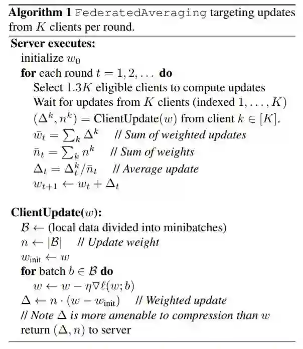 再考虑到能够增强联合学习中保护隐私的方法,包括差异化隐私策略(McMahan等,2018)和安全聚合(Bonawitz等,2017),这些方法基本上需要一些固定设备上的同步后的概念,让学习算法的服务器端可以仅消耗来自众多用户的更新信息的简单聚合。