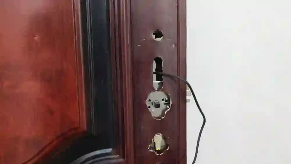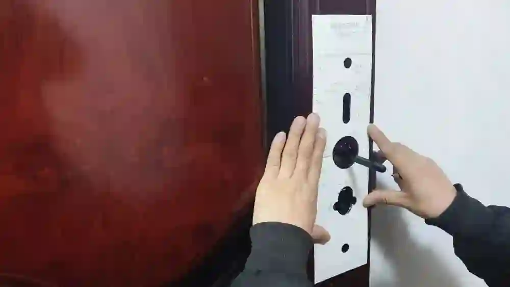 拆卸掉我原先房门上的锁具后,师傅测试了门锁面板的孔位,然后将原有孔位都做了进一步放大,采用专业工具一点点磨下去,并且将边缘处都做了修缮,没有毛刺感。