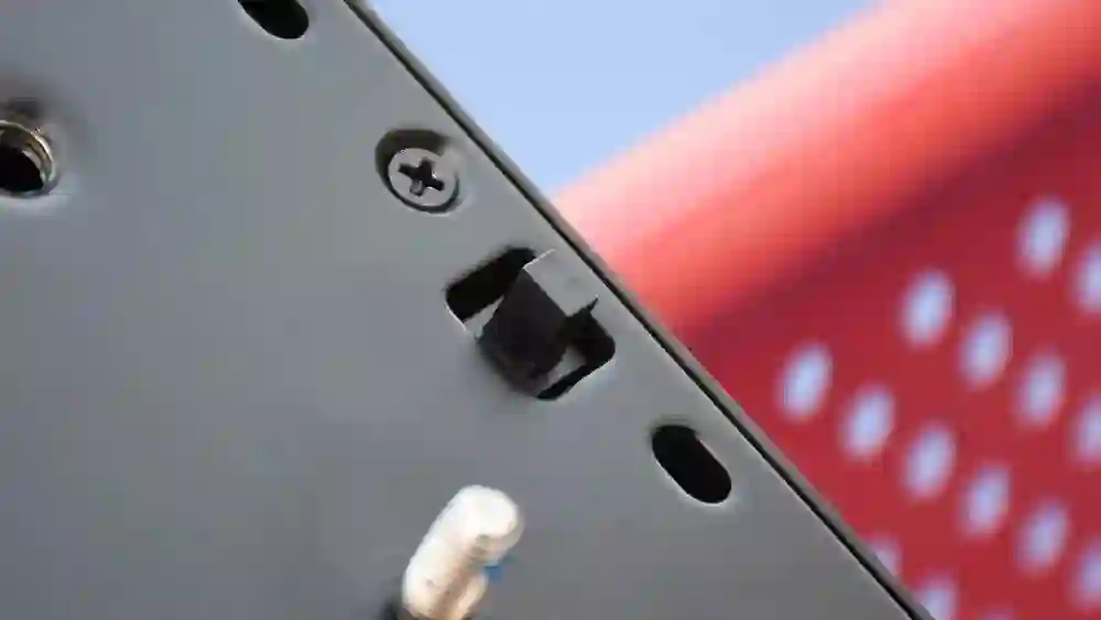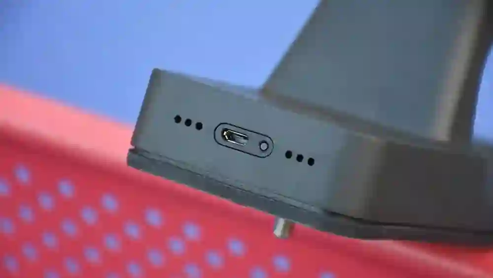 最下方是经典的米家盾牌标,相信大家都不陌生。外侧面板底部还预留有 Micro USB 应急供电接口以及左右两侧的扬声器开孔。