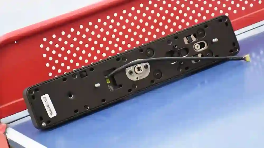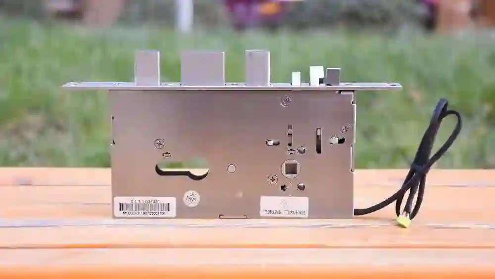 面板背部采用了非常厚实的金属板材作为支撑和包裹,并有密集的螺丝固定。在靠上方的开孔处从门锁主板延伸出来一条编织线材,用来与内侧门锁面板相连,旁边的一个座子是用来与锁体的线材连接的。