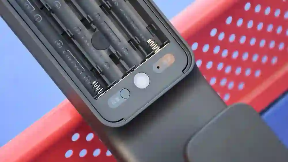 内侧面板基本与外侧保持一致的设计,最上方是电池仓位,外侧盖板可以通过顶部的固定卡扣打开,电视仓内可以容纳 8 节五号电池。在电池仓下方有设置按键和重置软键,便于主人在室内对门锁进行设置和重置操作。