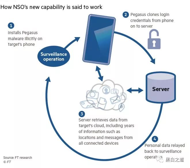 以色列公司NSO集团一直在告诉其政府客户,其Pegasus恶意软件现在可以提取更多关于任何特定个人的数据。除了该人智能手机上的数据外,该组织声称可以隐蔽地检索该人存储在Apple,Google,Microsoft,Facebook和亚马逊所拥有服务器上的所有信息。据英国“金融时报”报道,其中包括所有信息和照片,以及有关手机位置整个历史的数据。
