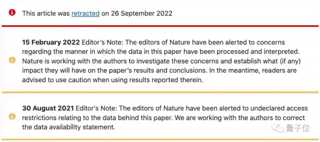 在这样的声浪下,Nature的论文主页上接连出现了“三连警告”,并正式于今年9月26日撤稿论文。