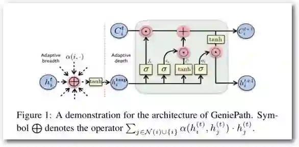 之前提到的算法对于不同阶邻居,不同传播路径是同等对待的。在GeniePath中,模型引入LSTM的遗忘门机制,使得不同阶邻居、不同的传播路径对最终的Embedding影响不同。