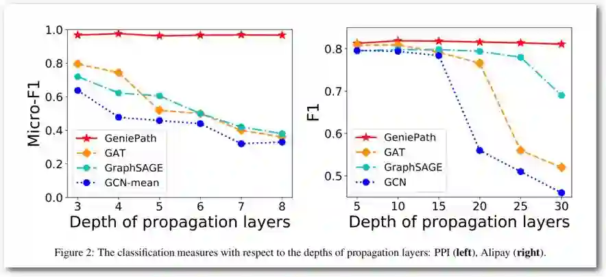 由图7可看到,GeniePath在应用Attention机制之后又过了一个LSTM,从实验的角度看,这种做法使得GCN的层数增加并保持模型的效果不衰减,但是同时也增加了大量的参数。