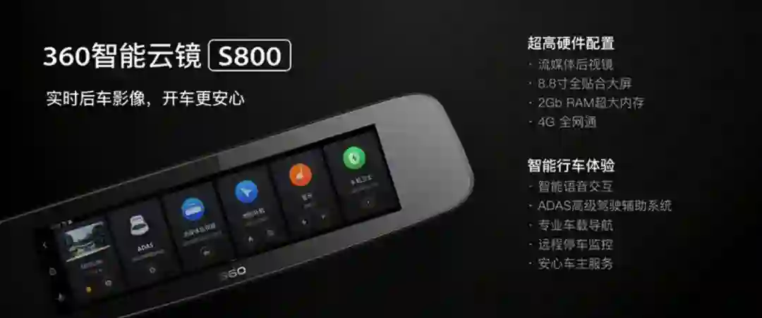 不过在智能硬件领域,360 还在持续发力。随 N7 一同发布的 360 智能云镜 S800,用流媒体的方式显示后方道路和车辆画面,算是 S650 的升级款。
