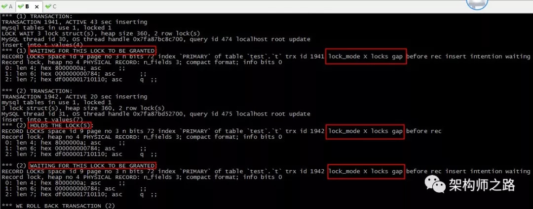 当然,InnoDB有死锁检测机制,B和C中的一个事务会插入成功,另一个事务会自动放弃: