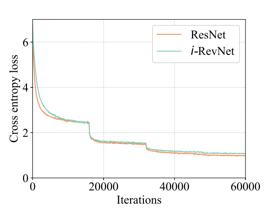 图 3:在 ImageNet 上 i-RevNet (b) 和 ResNet 的训练损失对比。