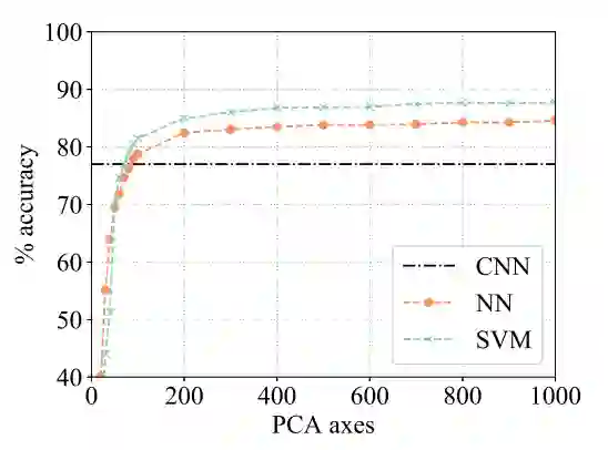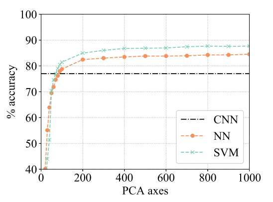 图 7:线性 SVM 和最近邻在保留不同维度的主成分时的准确率