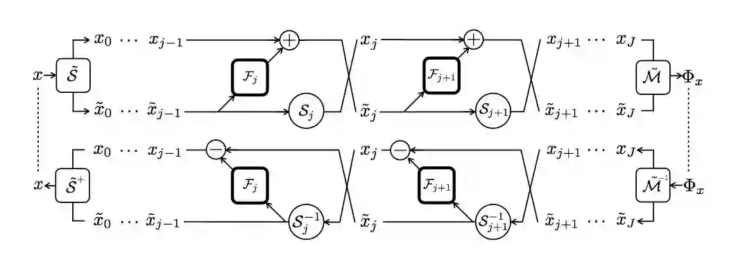 图 1: i-RevNet 和它的逆网络的主要组成。RevNet 模块与卷积瓶颈 F_j 交替连接,并且对 S_j 运算进行洗牌,以保证架构的可逆性和计算效率。输入通过分割算子 S˜进行处理,输出结果通过 M˜处理进行合并,注意,逆网络是通过最小适应(minimal adaptations)获得的。