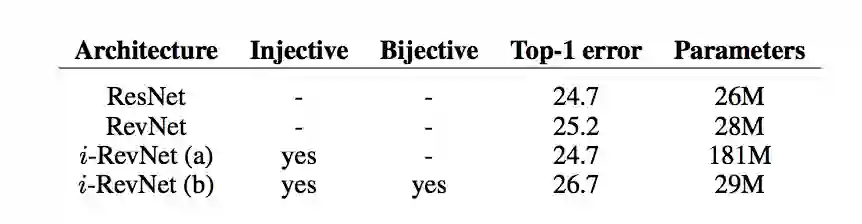 研究者引入了 i-RevNet,这是一种可逆的深度网络,i-RevNets 在除最后一层的所有中间表征中保留了输入信号的所有信息。该架构架构是基于最近提出的 RevNet(Gomez et al., 2017) 建立的,用可逆组件代替了原始 RevNets 结构中的非可逆组件,i-RevNet 在 ImageNet 上达到了与非可逆 RevNet 和 ResNet 相同的性能 (Gomez et al., 2017; He et al., 2016)。在这个架构中,本文证明:在学习可以泛化到陌生数据的表征时,信息损失并不是必要条件。