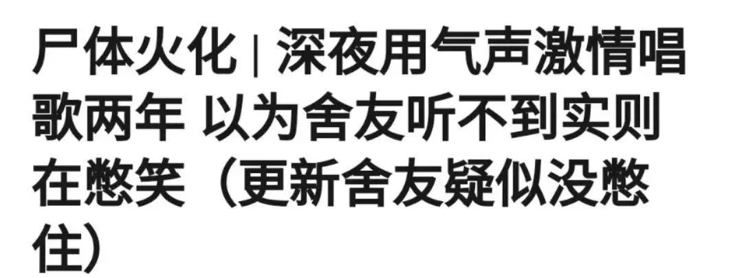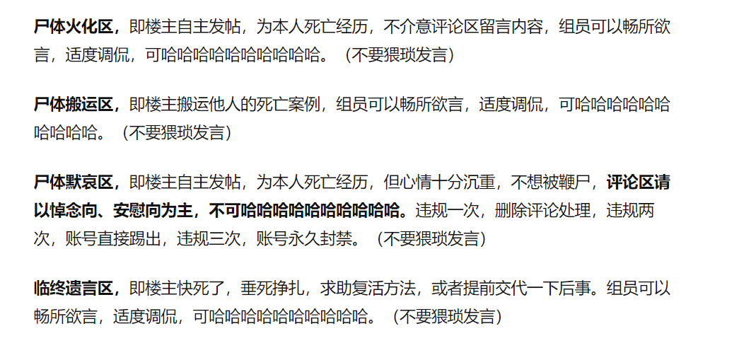 而如果心情过于沉重,无法承受组员的“鞭尸”,则可以在【尸体默哀区】里发帖,评论以安慰为主,组员被禁止调侃楼主,违反者将受到踢出处理。