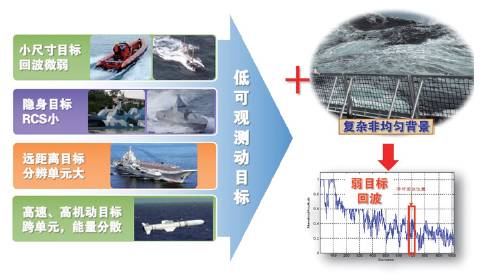 雷达作为目标探测和监视的主要手段,在空中和海面目标监视以及预警探测等公共和国防安全领域应用广泛。然而受复杂背景环境(陆地、城市、海洋等)及目标复杂运动特性的影响,目标雷达回波极其微弱、特性复杂,具有低可观测性,使得雷达对动目标的探测性能难以满足实际需求。复杂背景下低可观测动目标探测技术成为影响雷达性能的关键制约因素,也是世界性难题。具体体现在:1)目标运动特性复杂,雷达低可观测动目标主要包括“低(低掠射角照射,杂波强)、慢(慢速目标,易受杂波遮蔽)、小(小尺寸目标,回波微弱)、快(高速高机动目标,能量发散积累效果差)、隐(隐身目标,回波微弱)”等类型;2)强杂波极易湮没目标回波信号,并形成大量类似于目标的尖峰信号,严重影响雷达对弱小目标的探测和监视性能;3)雷达观测范围广,回波数据量大,新体制雷达采用数字化阵列等技术,在提高信号采样质量的同时进一步增加了数据量,对算法的实时处理提出了极高要求;4)存在岛屿、岛礁、陆海交界、强点源干扰、多目标等复杂情况。