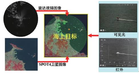 仅靠雷达这一单一的对海探测手段,仅能获取目标的幅度、速度等信息,难以有效地对目标进行分类和识别。同时受观测角度、波段等影响,目标回波时隐时现,探测概率低。采用多手段联合对海探测,把不同平台的雷达、光学红外信息进行融合,可获得目标的位置信息、运动轨迹信息、身份类型信息、外形轮廓等,进一步提高探测和识别概率。图3为多传感器综合对海监视系统示意图。