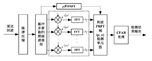 以傅里叶变换为核心的傅里叶分析理论体系在分析与处理平稳信号时具有极大的优越性,然而在雷达高速高机动目标探测、低慢小目标以及多目标的探测与识别中,信号呈现出时变、非平稳等复杂特性。分数阶傅里叶变换(fractional Fourier transform,FRFT)以LFM作为基函数,介于时域和频域之间的任意分数域表征,能够反映多普勒的变化规律,非常适于处理时变的非平稳信号,且无交叉项的干扰,从而引发了分数域信号处理理论的研究热潮。海军航空工程学院海上目标探测课题组研究了分数域海杂波抑制与动目标检测方法(原理框图如图4 所示),采用FRFT 谱及短时FRFT(short- time FRFT,STFRFT)。对目标信号匹配增强,实现时变非平稳信号的时频谱高分辨表示。