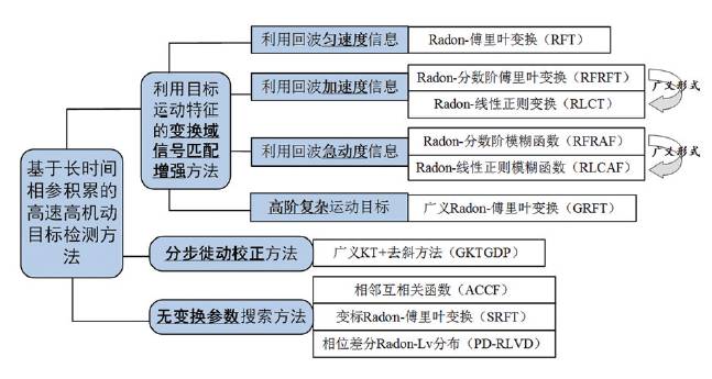 目前,如何有效地同步完成距离和多普勒徙动的补偿成为长时间相参积累的关键问题。北京理工大学许稼教授提出的空时频检测前聚焦(focus-before-detects,FBD)雷达信号处理方法为长时间相参积累技术理论发展和应用提供了新的研究思路,提出的Radon-傅里叶变换(Radon-FT,RFT)和广义RFT(generalized RFT,GRFT)方法通过联合搜索参数空间中目标参数的方式解决了距离徙动与相位调制耦合的问题,可实现运动目标“三跨”(跨距离、多普勒和波束)情形下有效的相参积累。目前该领域主要有以下几个研究方向(图6):1)利用目标运动特征的变换域信号匹配增强方法,主要利用目标的加速度、急动度及高阶运动特征设计相应的变换域匹配增强方法,如Radon- FRFT(Radon- FRFT,RFRFT)。Radon- 线性正则变换(Radon- linear canonical transform,RLCT)、Radon-分数阶模糊函数(Radon-fractional ambiguity function,RFRAF)和Radon-线性正则模糊函数(Radon-linear canonical ambiguity function,RLCAF)等方法,用于空中高速高机动目标以及海上微动目标的检测;2)分步徙动校正法,即采用广义Keystone变换(KT)和去斜方法分别对距离和多普勒徙动进行分步补偿,但该类方法的问题在于后续多普勒徙动补偿的效果受距离徙动补偿结果影响;3)无变换参数搜索法,该类方法可直接将目标的运动特征体现在设计的变换域中,提高参数估计精度。