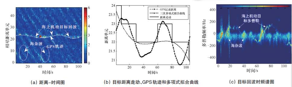 图5 为X 波段南非科学与工业研究理事会(Council for Scientific and Industrial Research,CSIR)试验雷达实测数据(TFC17-006)分析,其中图5(a)的距离-时间图表明雷达观测时间为100 s,观测范围约45个距离单元,仅通过幅度难以从强海杂波中发现目标。图5(b)为目标距离走动、GPS轨迹和多项式拟合曲线示意图,可知目标在观测时间内跨越了多个距离单元,具有高机动特性。进一步分析回波的时频谱图(图5(c)),可看出目标多普勒随时间变化,近似有周期振荡性,海杂波频谱较宽,覆盖了大部分目标频谱。因此,目标回波能量在距离和多普勒维均发散,需要进行补偿提高相参积累增益。