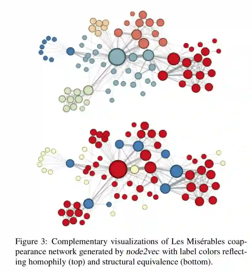 Node2Vec的最后一点是,它有参数来形成随机游动。使用“in -out”超参数,你可以确定游走的优先级是集中在小的局部区域(例如,这些节点是否在相同的小社区中?),还是游走在图的广泛分布中(例如,这些节点是否在相同类型的结构中?)
