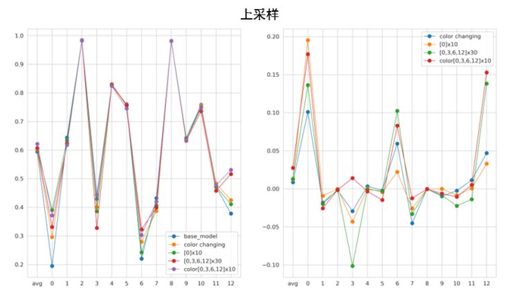 下图左边是上采样之后各个标签的 F2 score,右边是提升值。比赛中对 0,3,6,12 这四个标签进行了上采样,可以看到这四个标签平均提升值大约在 3.5% 左右。