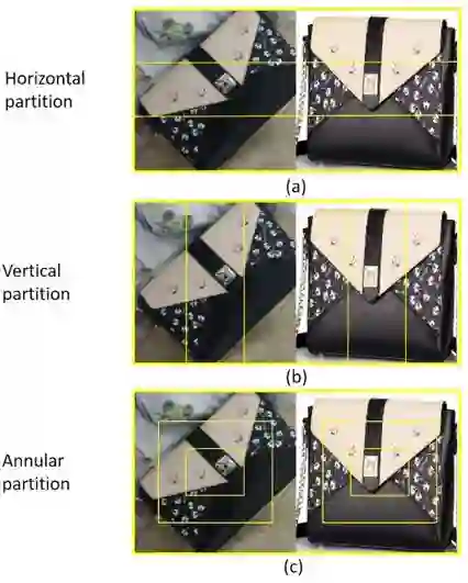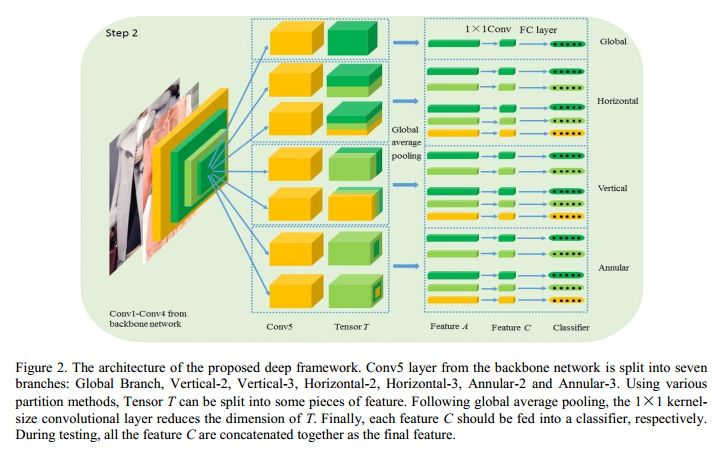 全局分支负责学习全局特征,以保持模型对整体信息的抓取能力。横向分支主要学习具有水平方向的平移不变性的特征,为了能够在不同尺度上学习这一特征,模型对特征图在水平方向上进行不同粒度的切分:一个均分为两等分,一个均分为三等分。最终水平方向会产生 5 个局部特征,每个局部特征都会经过平均池化和最大值池化以及一个 1x1 卷积后用于商品分类器的训练。类似地,纵向分支的目的是学习具有垂直方向平移不变性的特征。