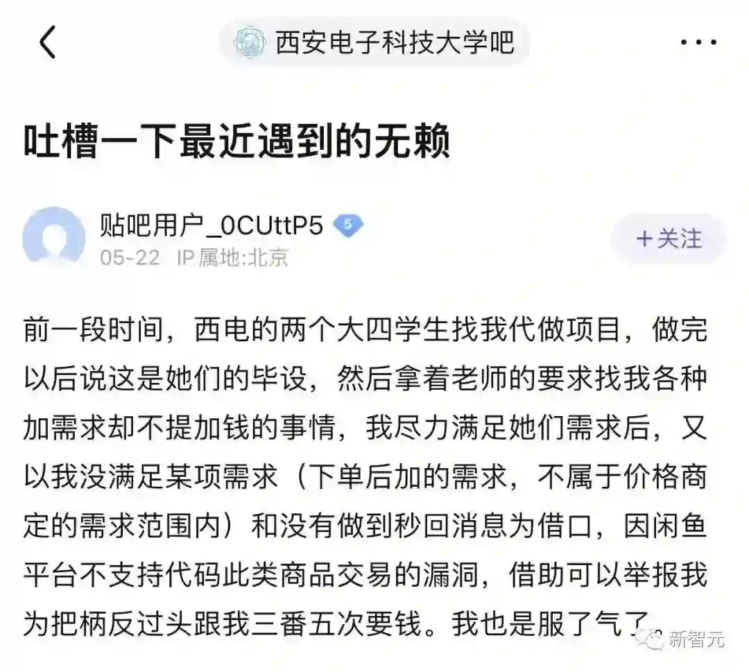 在此前西电的「毕设门」事件中, 两名大四女生雇枪手做毕设,给钱后反悔,还讹诈枪手。