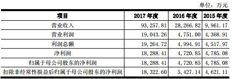2015-2017年,趣炫网络主营业务收入分别为1亿元、2.8亿元和9.3亿元,同期净利润分别为4785.08万元,4720.85万元,18288.41万元。营业利润率分别为43.86%、16.81%和20.42%。同比主营业务收入增长率分别为183.78%和229.92%,净利润增长率为-2.08%和289.36%。