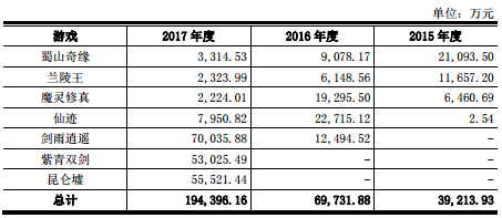 数据显示,2015-2017年,七款游戏实现的营业收入总额分别为9,584.47万元、25,607.87万元、88,379.66万元,占当期公司主营业务收入的比重分别为96.22%、90.59%和94.77%,是公司的主要收入来源。