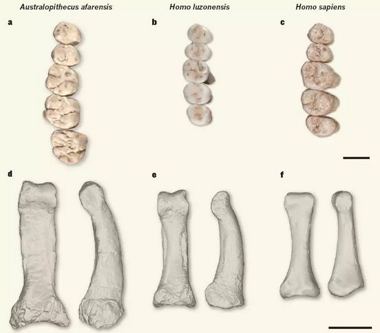 矮小之外,“吕宋人”又有一些原始特征。他们的手指和脚部骨骼呈现弯曲,这与适应攀爬生活的南方古猿类似。南方古猿是现代人和其他人属成员的古老祖先,生活在距今数百万年前的非洲大陆。另外,他们前臼齿(虎牙往里的两颗牙齿)有两个到三个牙根,这与第一批走出非洲的直立人(Homo erectus)类似,而现代人的只有一个。
