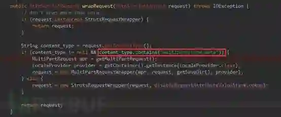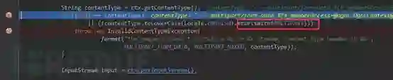 继续跟进,发现会对ContentType进行判断,看是否包含multipart/form-data字段,包含就继续,不包含就G,这就是说为什么网上流传的那些poc为什么都需要构造multipart/form-data字段。跟进getMultiPartRequest