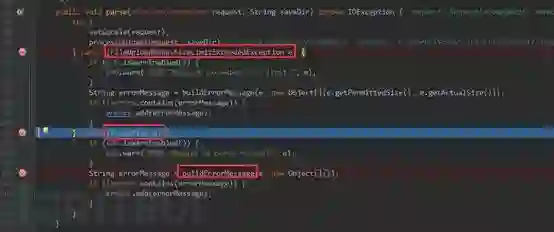 放发生异常后,又会返回到JakartaMultiPartRequest类的parse方法对异常进行处理。看一看有两异常,第一个文件过大异常,和除文件过大外的其它异常。当发生异常后他们都会进入一个神奇的方法buildErrorMessage。