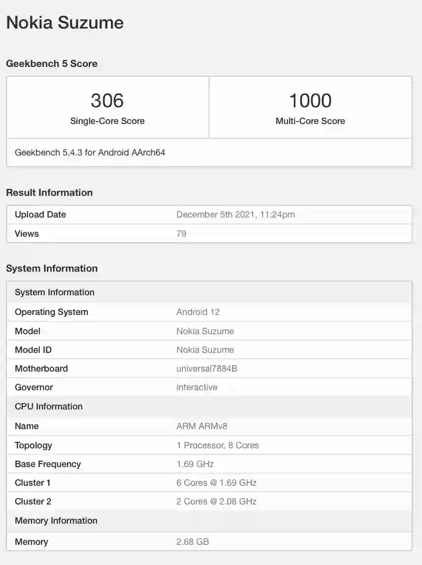 今日,在 Geekbench 上出现了即将推出的诺基亚 Suzume 智能手机。据透露,这款智能手机配备了八核处理器,预计将是三星 Exynos 7884 芯片组,与为韩国公司的三星 A10 提供动力的处理器相同。三星 Exynos 7884 芯片组是使用 14 纳米处理器制造的,配备了两个 Cortex-A73 内核和六个 A53 内核,以及一个 Mali-G71 MP2 GPU 和一个 LTE 调制解调器。此外,这款诺基亚 Suzume 智能手机配备了 3GB 的 RAM,运行 Android 12 操作系统,在单核测试中获得了 306 分,而在多核测试中获得了 1,000 分。