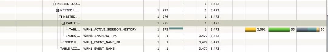 通过报告可明显观察到整个SQL消耗的IO基本来源于WRH$_ACTIVE_SESSION_HISTORY这张表。监视报告中选中plan,再以Tabular方式查看,可查看访问表的谓词,正常情况下这个表是会分区的,目前看起来数据都集中在了一个分区。