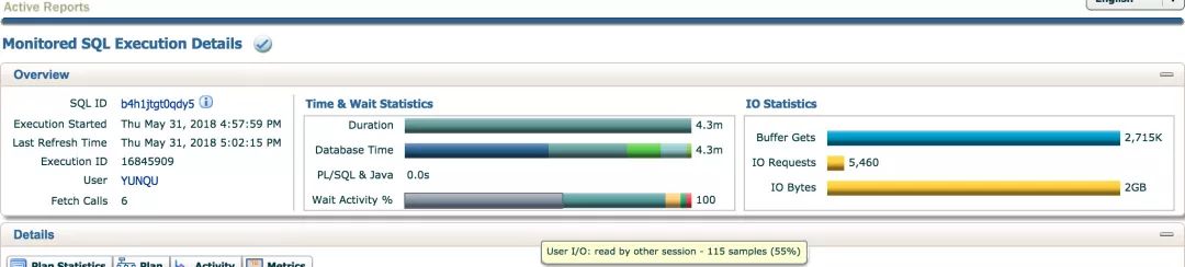 打开报告,通过Wait Activity中可发现55%时间是read by other session等待事件,还有36%为gc相关等待事件,结合2GB的IO,可以基本可知问题原因为SQL读取IO量过多,在RAC高并发环境下,性能问题被放大。