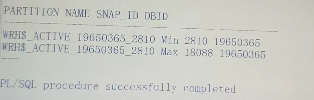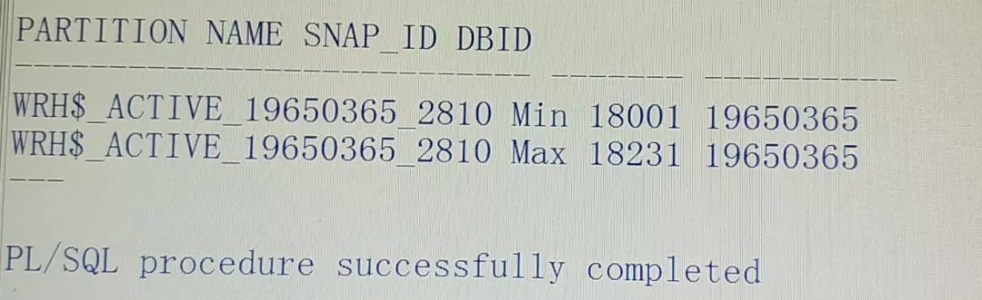 exec DBMS_WORKLOAD_REPOSITORY.DROP_SNAPSHOT_RANGE(low_snap_id =>2810,high_snap_id =>18000);