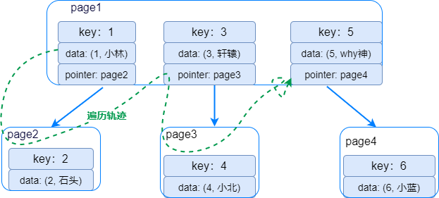 在不考虑任何优化的前提下,图中绿色虚线是在B树索引上查找数据的遍历轨迹 ,来拆解一下: