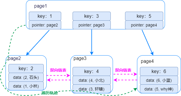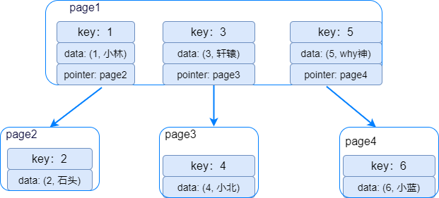 重新加载磁盘页 page1 找到第三个节点 key=5 符合,读取数据行(5,why神)。