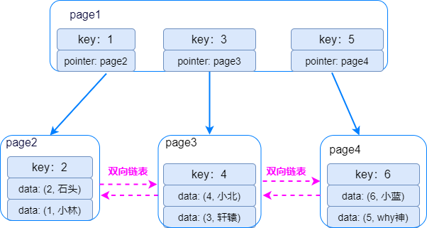 继续通过指针加载磁盘页 page4 到内存,key=4 符合,读取数据行(4,小北)。