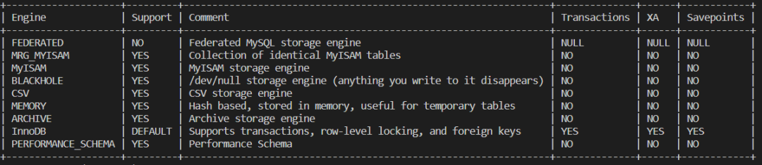 MySQL目前支持的存储引擎种类非常丰富,可以在连接MySQL客户端,进入到命令行模式下,输入如下命令查看当前版本MySQL提供的所有存储引擎。