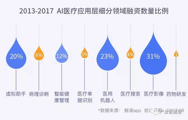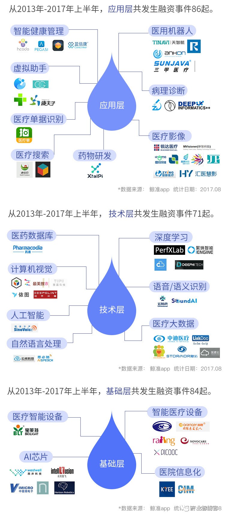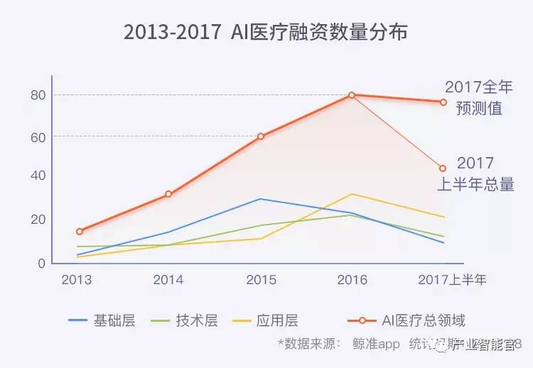 回顾13年-17年数据,从2015年开始,基础层热度明显下滑,而资本开始纷纷进入应用层。2017上半年AI医疗发生融资数量46起,下面是应用层各维度融资情况。