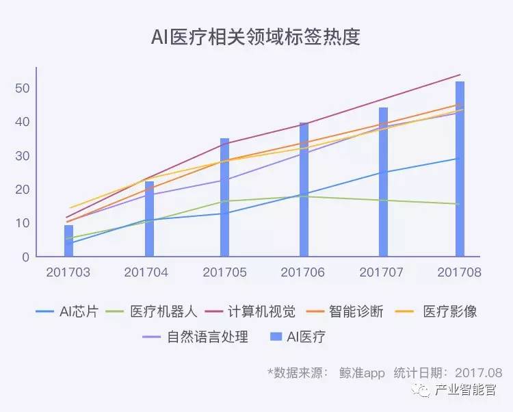根据鲸准中心标签热度算法统计,有关于AI医疗的标签:深度学习、计算机视觉、AI医疗、智能诊断、医疗影像、自然语言处理、AI芯片、医疗大数据关注度有较大提升。