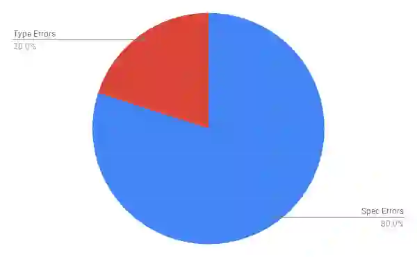 为什么 TypeScript 检测不到这么多 bug,为什么我把减少 20% 的 bug 密度说成是“理论上最大的”?首先,GitHub 上有 78% 的公开 bug 是由规范错误引起的。在很大程度上,未能正确实现规范是最常见的错误类型,而这导致了 TypeScript 无法检测或预防绝大多数 bug。在上述的研究报告中,研究人员对一系列“TypeScript 检测不到的错误”进行了分类。