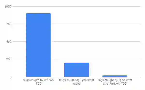 评审和 TDD 在没有 TypeScript 的情况下捕获 1000 个 bug 中的 900 个。如果忽略评审和 TDD, TypeScript 会捕获 1000 个 bug 中的 100 个。显然,你不一定是在它们之中做出选择,而是在采取其他措施之后再加入 TypeScript,而此时获得的改进非常有限。