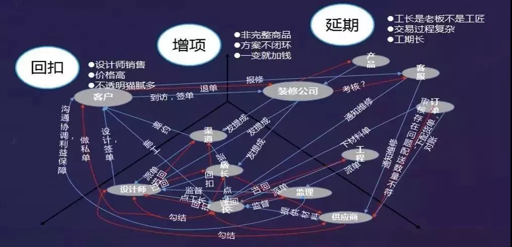 前两类创新都是B端思维,运用B2C的逻辑,即“我有什么能提供给它”;而第三类颠覆式创新,则更强调“客户需要什么,客户有何痛点”,即C2B。传统家装产业是生产端思维,而互联网化的核心则是根据客户的需求来设计产品。