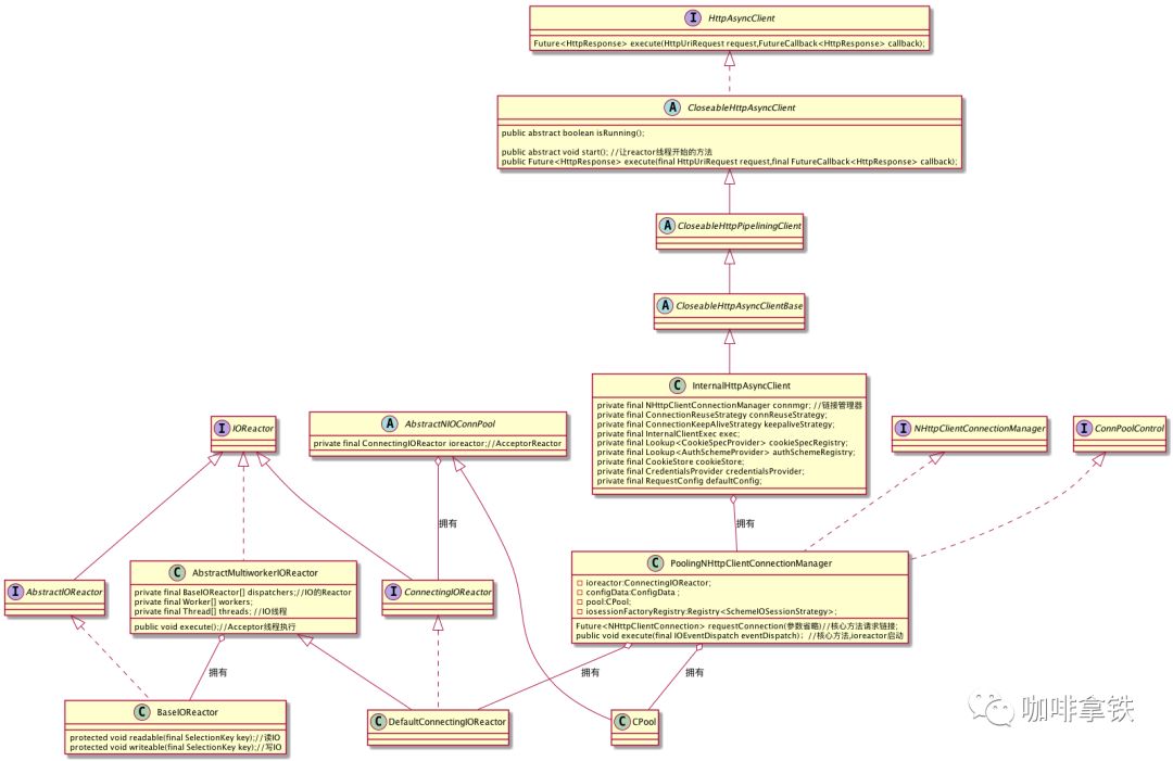 对于我们的HTTPAysncClient 其实最后使用的是InternalHttpAsyncClient,在InternalHttpAsyncClient中有个ConnectionManager,这个就是我们管理连接的管理器,而在httpAsync中只有一个实现那就是PoolingNHttpClientConnectionManager,这个连接管理器中有两个我们比较关心的一个是Reactor,一个是Cpool。