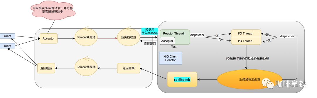 上面我们介绍了serlvet的异步化,相信细心的同学都看出来似乎并没有解决根本的问题,我的IO阻塞依然存在,只是换了个位置而已,当IO调用频繁同样会让业务线程池快速变满,虽然serlvet容器线程不被阻塞,但是这个业务依然会变得不可用。