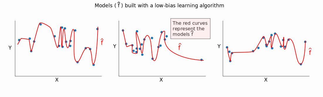 低 bias 的模型会很好地适应训练数据。如果我们改变训练集,会得到特别不一样的模型 f^。