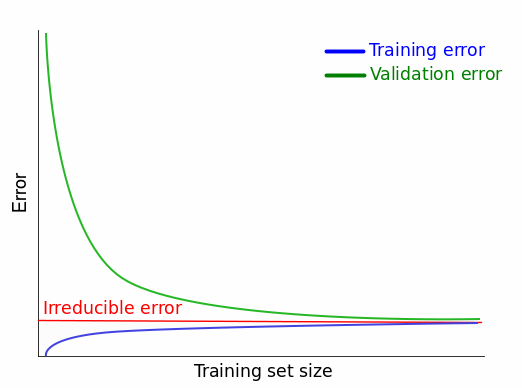 这告诉我们,在实际中性能最好的模型会收敛于某个不可约误差,而不是理想的误差值(对于 MSE,理想的误差值是 0;我们将会看到,其他的误差值会有和 MSE 不同的理想值)。