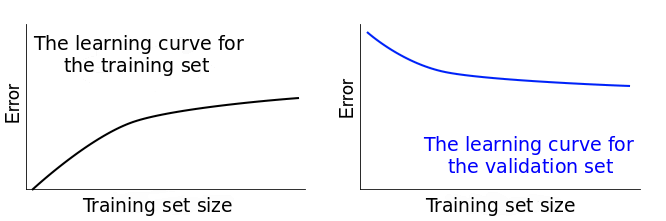 因此我们会监控两个误差得分:一个针对训练集,另一个针对验证集。如果我们把两个误差得分随着训练集的改变画出来,最终我们会得到两个曲线。它们被称为学习曲线。