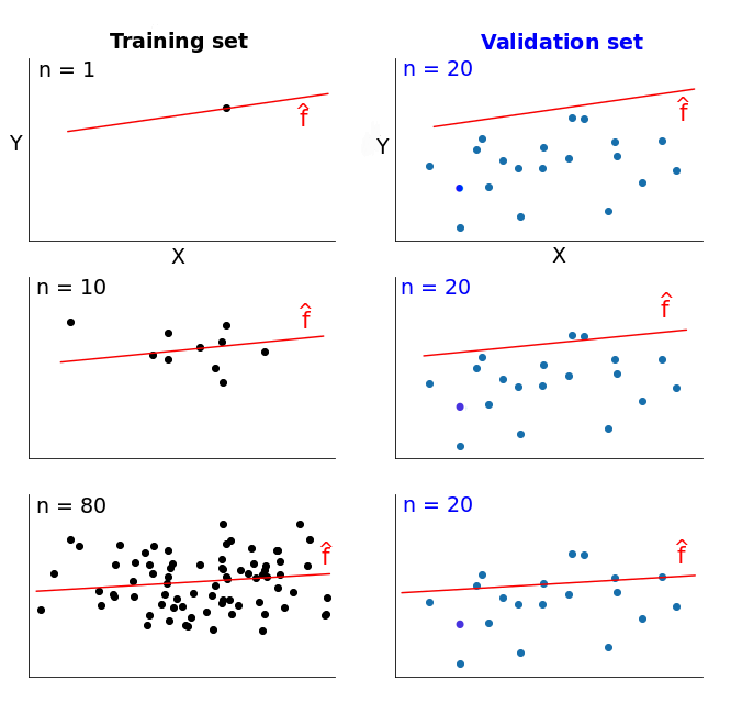 假设我们拥有一些数据,并且将它们分割成训练集和验证集。我们从训练集中拿一个例子(对,仅用一个样本)来训练模型,并用它来估计一个模型。然后我们在验证集上衡量这个基于一个训练样本的误差。在训练集上的误差是 0,因为它能够很容易地适应一个数据点。然而,在验证集上的误差会特别大。这是因为,这个模型是在一个样本上建立的,它几乎不能够准确地泛化到之前没有见过的数据上。
