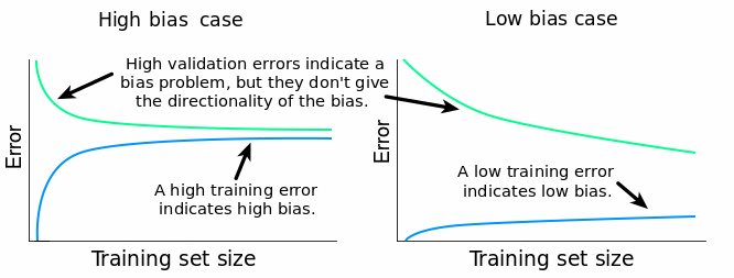 高的训练 MSE 得分也是一个快速检测低 variance 的方式。如果学习算法的 variance 比较低,那么当我们改变训练集的时候算法会生成比较简单并且比较相似的模型。因为模型过于简单,它们甚至不能很好的拟合训练数据集(欠拟合)。所以这种情况应该是较高的训练 MSE。所以,高训练 MSE 可以作为低 variance 的标志。